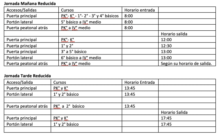 - Horario de salida de la jornada de la tarde, 18:45 y 19:30 horas, solo por entrada principal del colegio, no se abrirá portón de atrás.